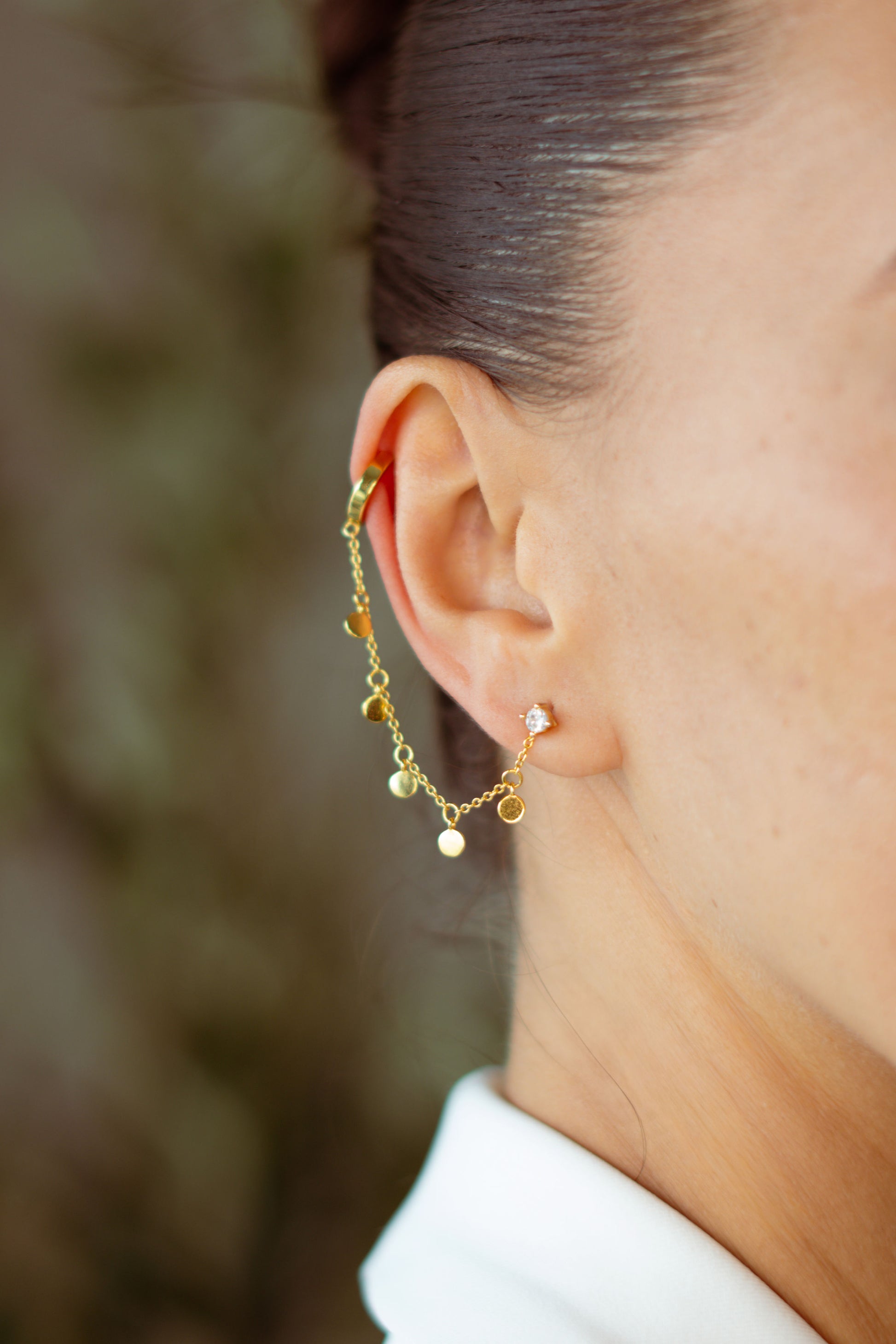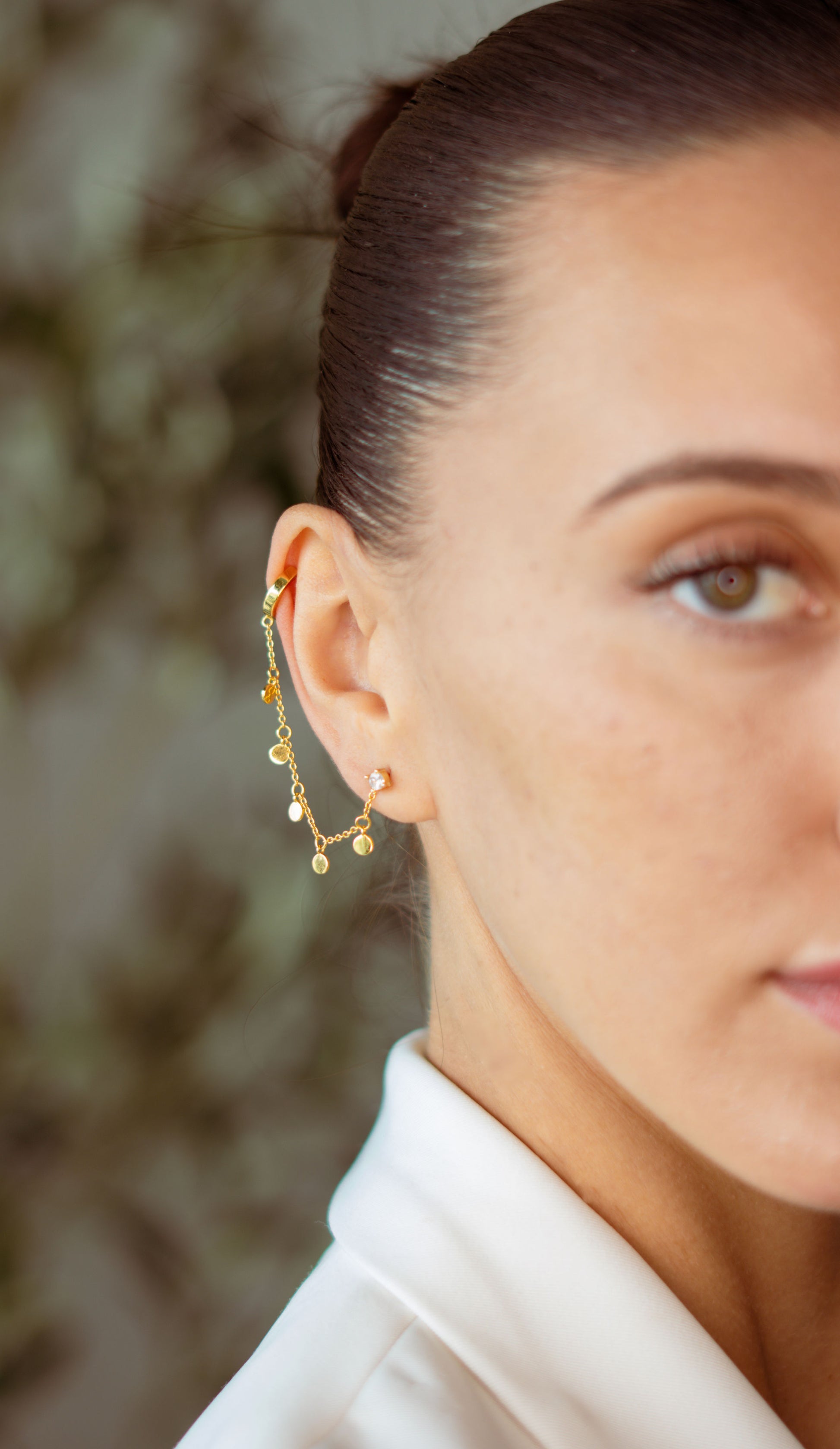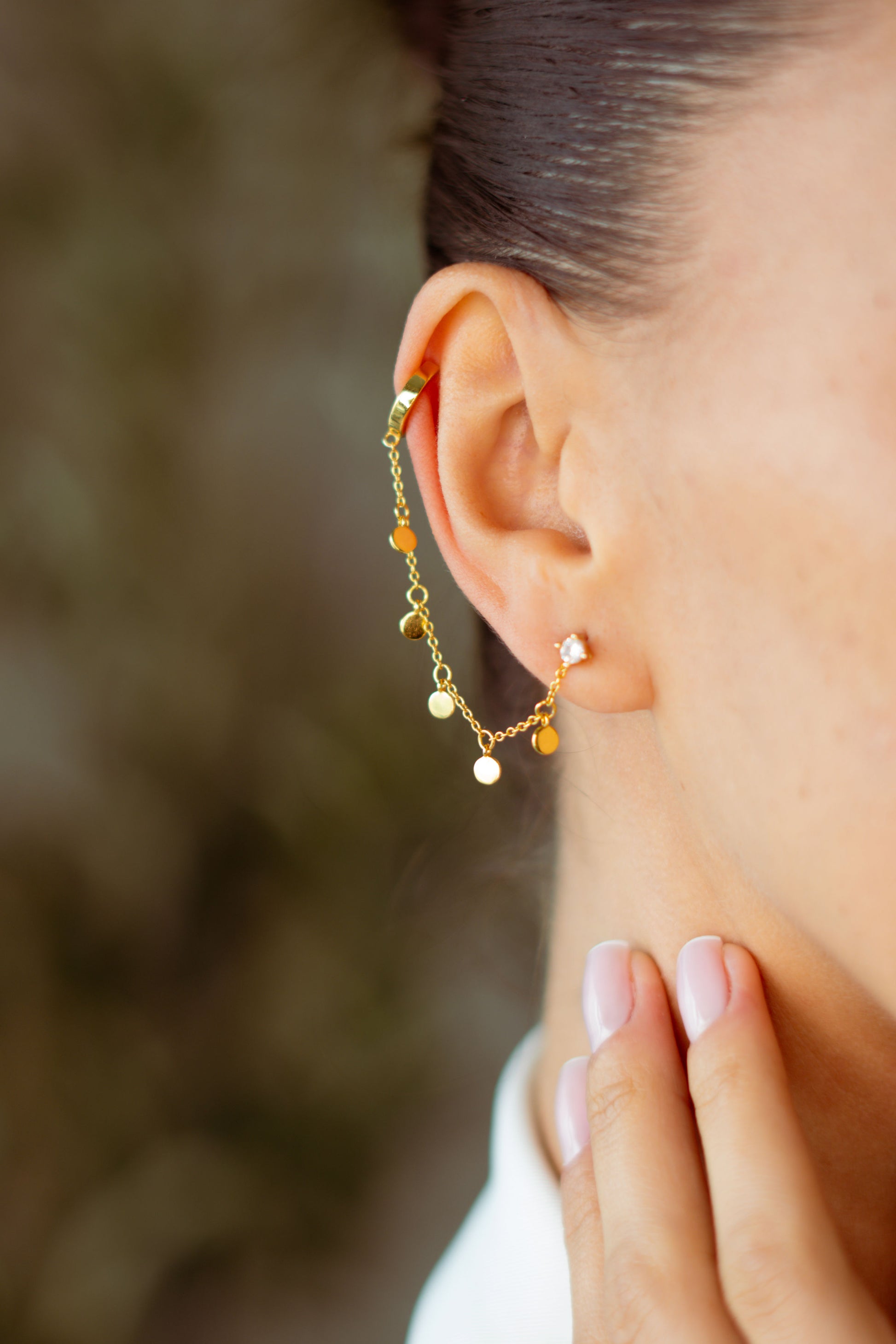 Luminous accent designed to frame the ear with golden elegance. Crafted from 18k gold-plated 925 sterling silver, the Halo Cuff drapes delicately with its fine chain and polished disc details.