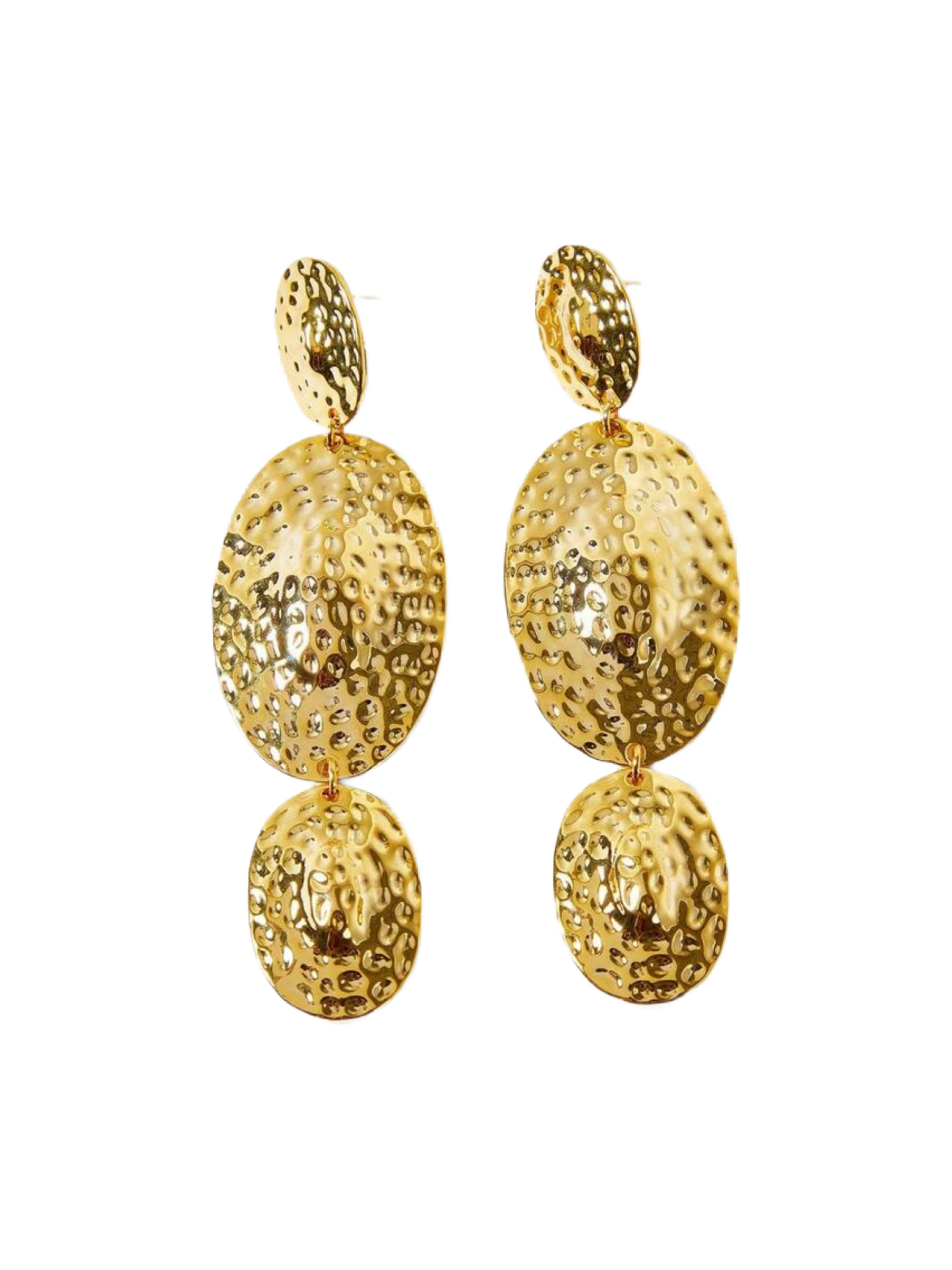 Sculptural hammered gold ovals cascade in a striking triple drop, catching light with every movement. A bold statement for evenings and special occasions.