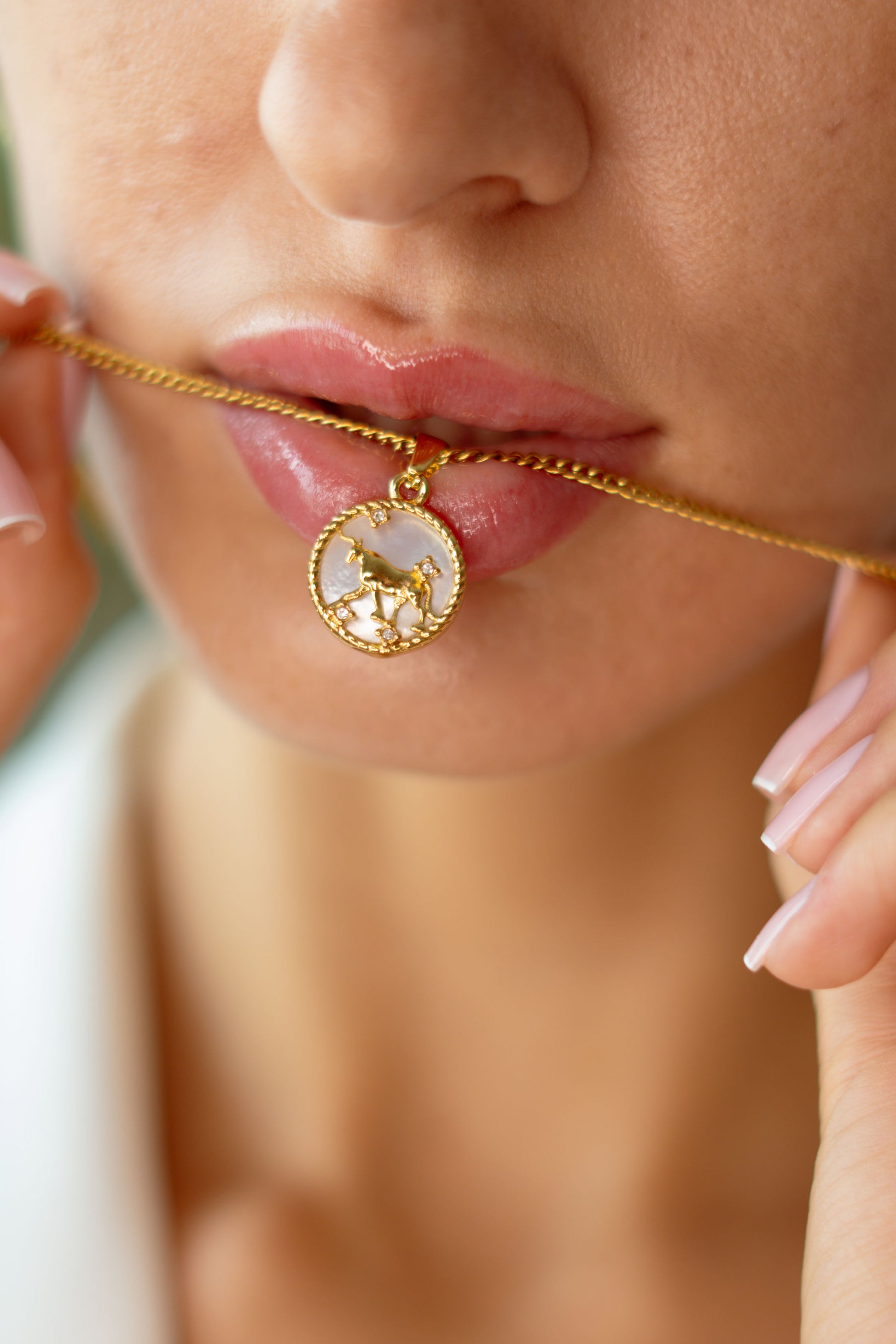 The Taurus Zodiac Necklace by NATIÈNE is crafted for those who move with quiet confidence and undeniable presence. Featuring an engraved 18k gold-plated Taurus pendant set against a mother of pearl enamel base, this piece is a symbol of grounded elegance and self-assured strength.